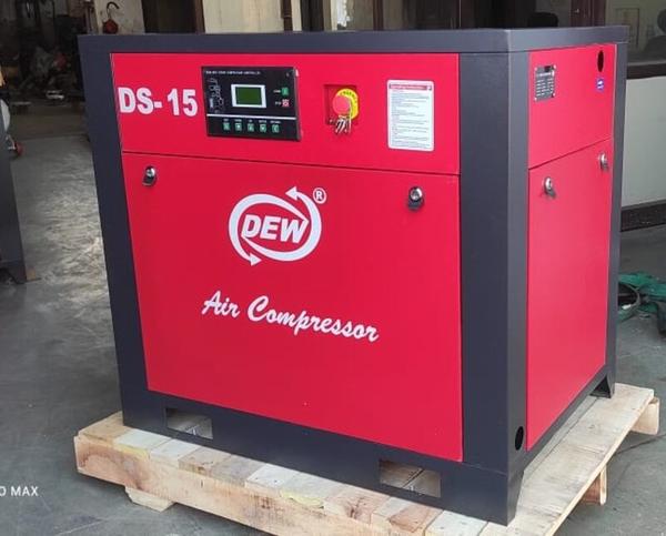 DEW Make Screw Air Compressor Model DS-15 (15HP)11 KW PM+VFDWorking Pressure Max. – 10 kg/cm2*CFM – 48 FAD @ 10 kg/cm2,*CFM – 58 FAD @ 8 kg/cm2*CFM – 62 FAD @ 7 kg/cm2*Power – 15 HP, (415 V/3/50 HZ) 11 kw*Sound Level – 60 +-2 DbA*RPM-2920*Compressed Air Control – Automatic (0-100%)*Drive: Direct Driven